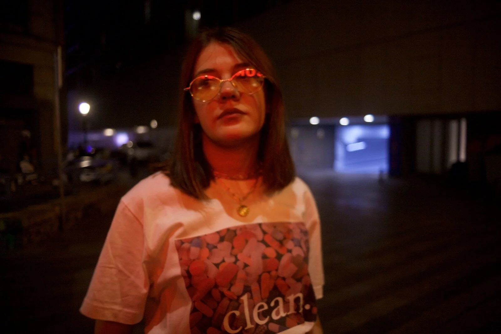 A woman with shoulder-length brown hair and wearing large glasses stands in a dimly lit area at night, wearing a T-shirt with a pill pattern and the word 'clean' printed on it, with blurred lights and structures in the background.