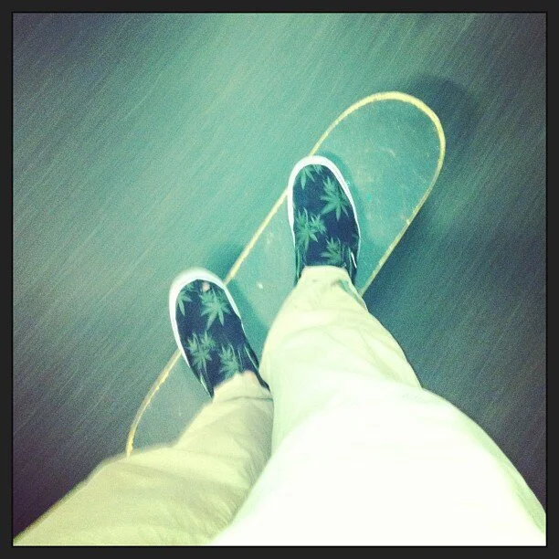 Photo from a top-down view of a person standing on a skateboard, wearing sandals with a marijuana leaf pattern, cream-colored pants, and walking on a dark pavement.