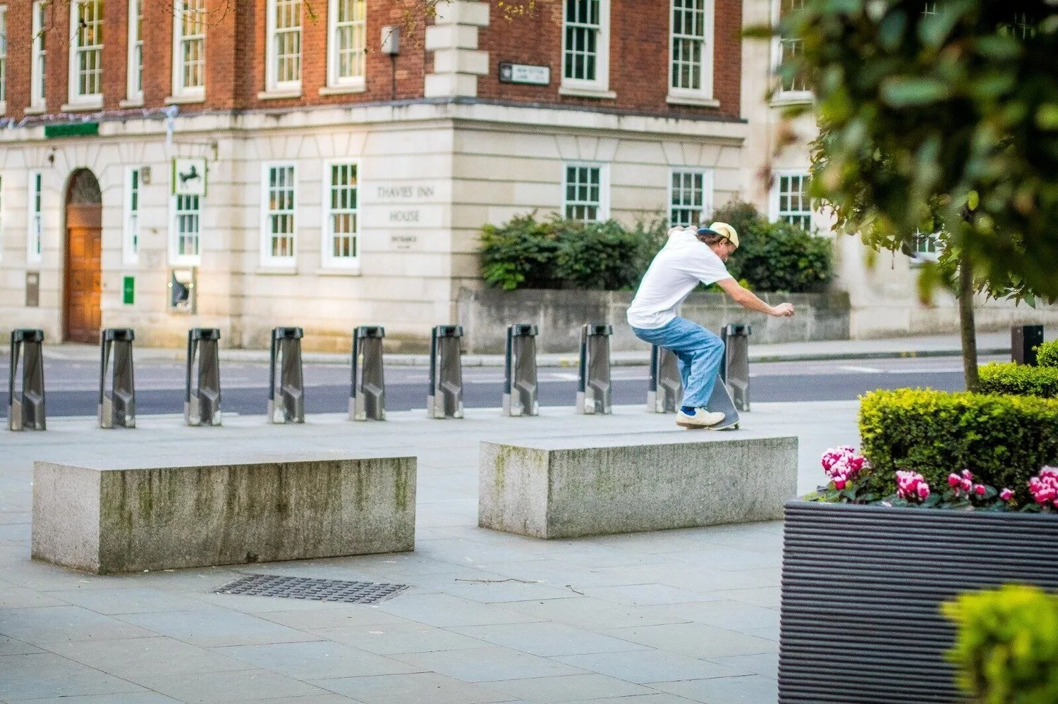 A person skateboarding on a ledge in an urban area with brick buildings, potted flowers, and highway barriers in the background.