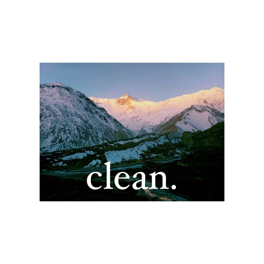 Mountain landscape with snow-capped peaks during sunset and the word 'clean.' in white text